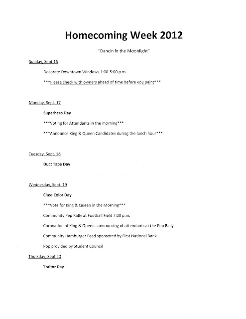 The pep rally will be held at the football field at 7:00 pm tonight. First National Bank will be serving hamburgers from 5:30-6:30 pm. The King and Queen will be crowned and Homecoming attendants announced during the pep rally.